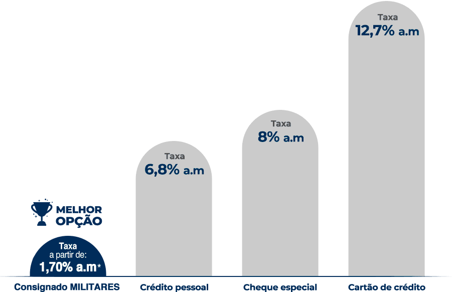 • Por ser descontado diretamente no contracheque do militar, o consignado MILITARES possui taxa de juros mais baixas do que outras modalidades de crédito, com taxa de juros a partir de 1,70% ao mês. (Taxa mínima recomendada para permitir Refinanciamento ou Portabilidade futuros)